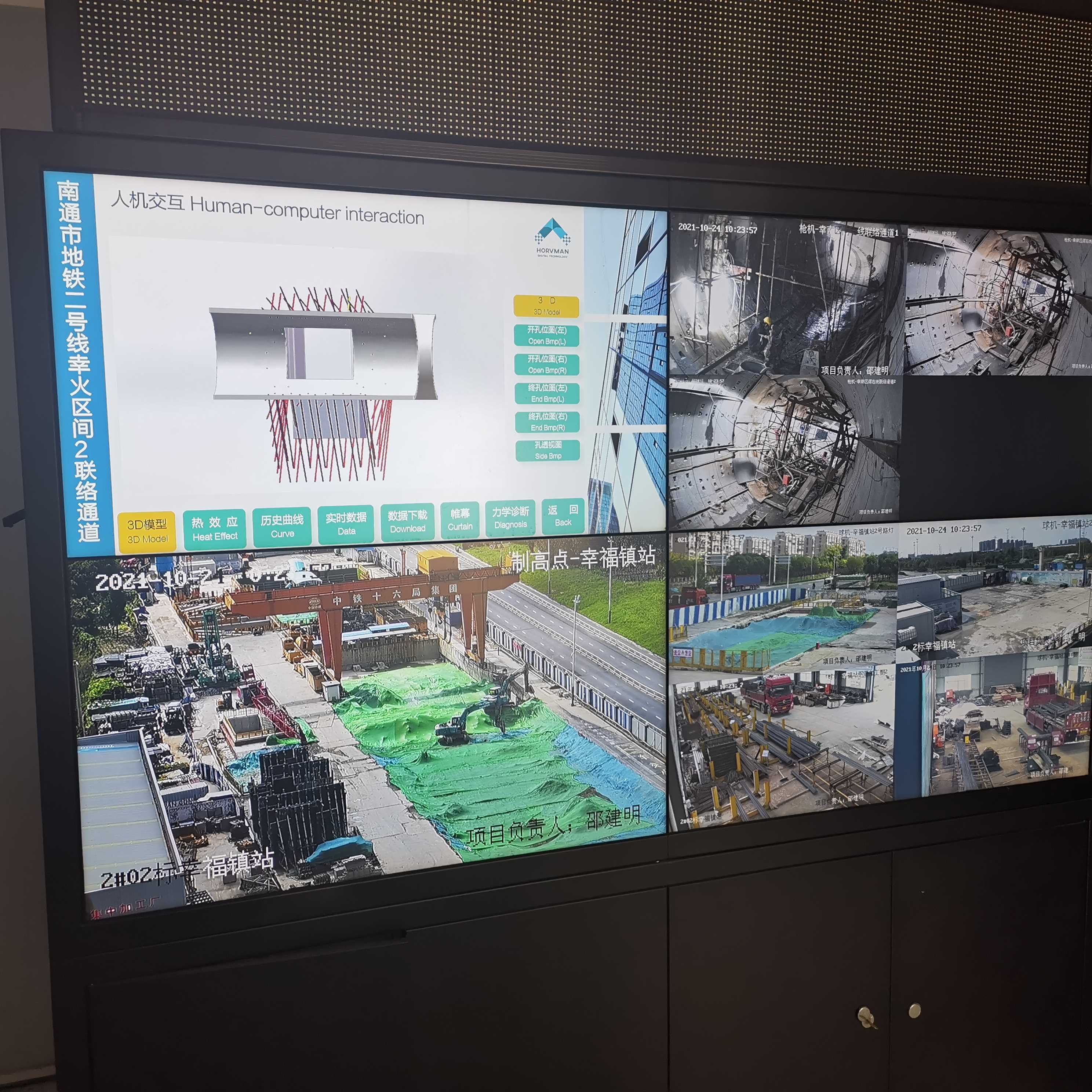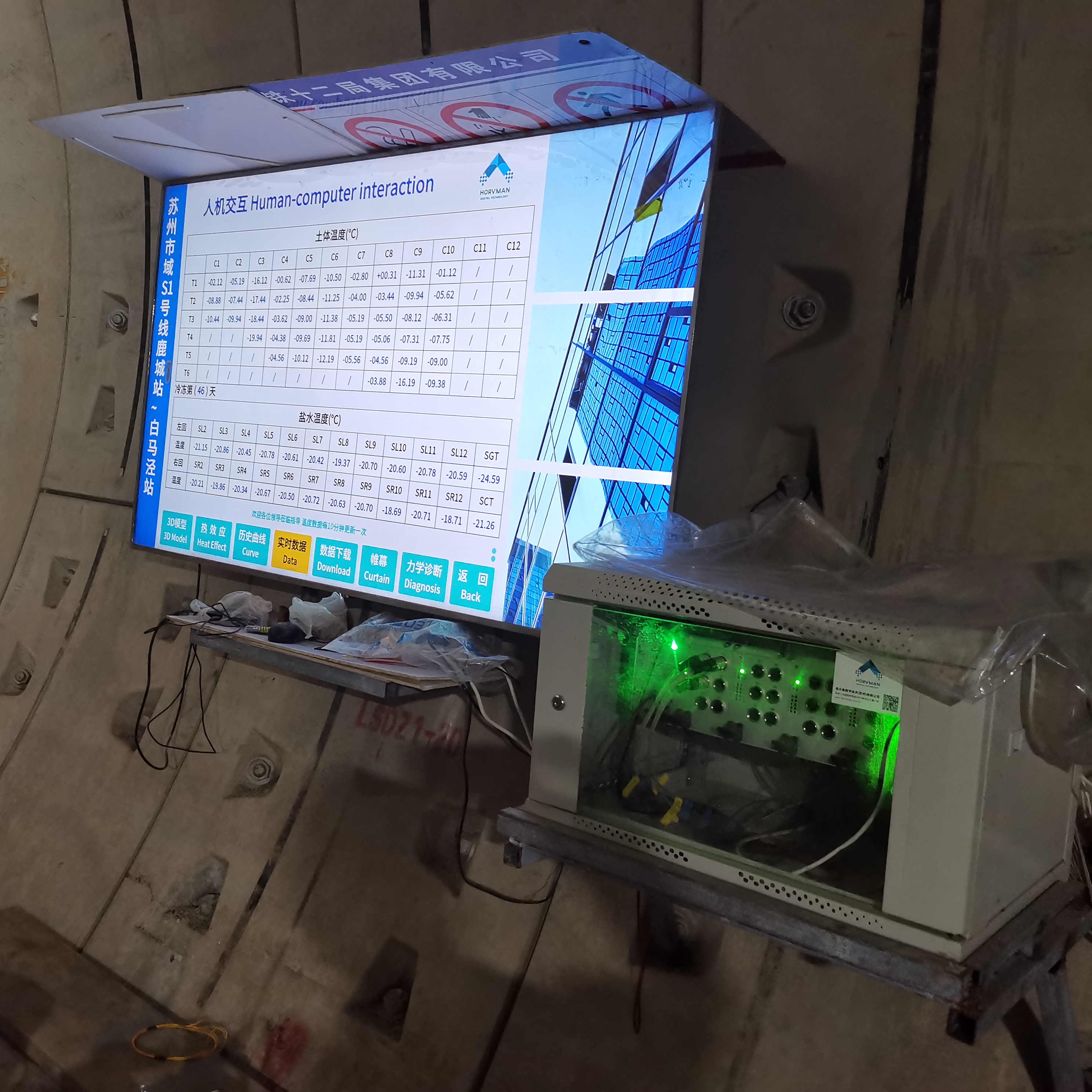 创新研发三维温度场自动化监测系统,夯实联络通道冷冻法施工风险管控基础为有效控制联络通道冷冻法开挖和构筑期间安全风险、HORVMAN研发了冷冻法 “三维温度场智能化监测系统”(简称ITTM,智能三维温度监测) 、该系统主要实现对冻结土体温度、盐水循环系统温度、清水循环系统温度等全时段实时监测、利用高精度数字温度传感器、对测温孔、盐水管路、清水管路的温度数据进行采集、储存、分析、并三维热效应建模、利用测温数据、对冻结壁冻土帷幕厚度进行计算分析、采集数据实时传输至阿里云大数据处理中心进行统计、为每个项目显示终端提供数据服务。该系统可以实时查看盐水管路循环系统和冻结土体实时温度数据、历史温度发展曲线和3D热效应模型、并根据土体冻结壁冻结帷幕厚度计算抗压、抗折、抗剪安全系数、明确冷冻周期、有效实现温度场数据远程监测和数据信息化建模、为冷冻法联络通道开挖施工提供了科学依据、全面提升了冷冻法暗挖施工安全风险控制水平。三维温度场智能化监测系统适用于联络道通冷冻法或盾构机始发和接收冷冻法温度监测,通过在施工现场安装数字电视机顶盒和用户手机上安装终端应用程序,可以实现远程无线查看实时数据信息和冻结效果3D热效应数据模型,有效评估冷冻法的进展情况及冷冻周期,降低冷冻法施工安全风险。目前该系统已成功指导完成多座联络通道冷冻法暗挖构筑施工。